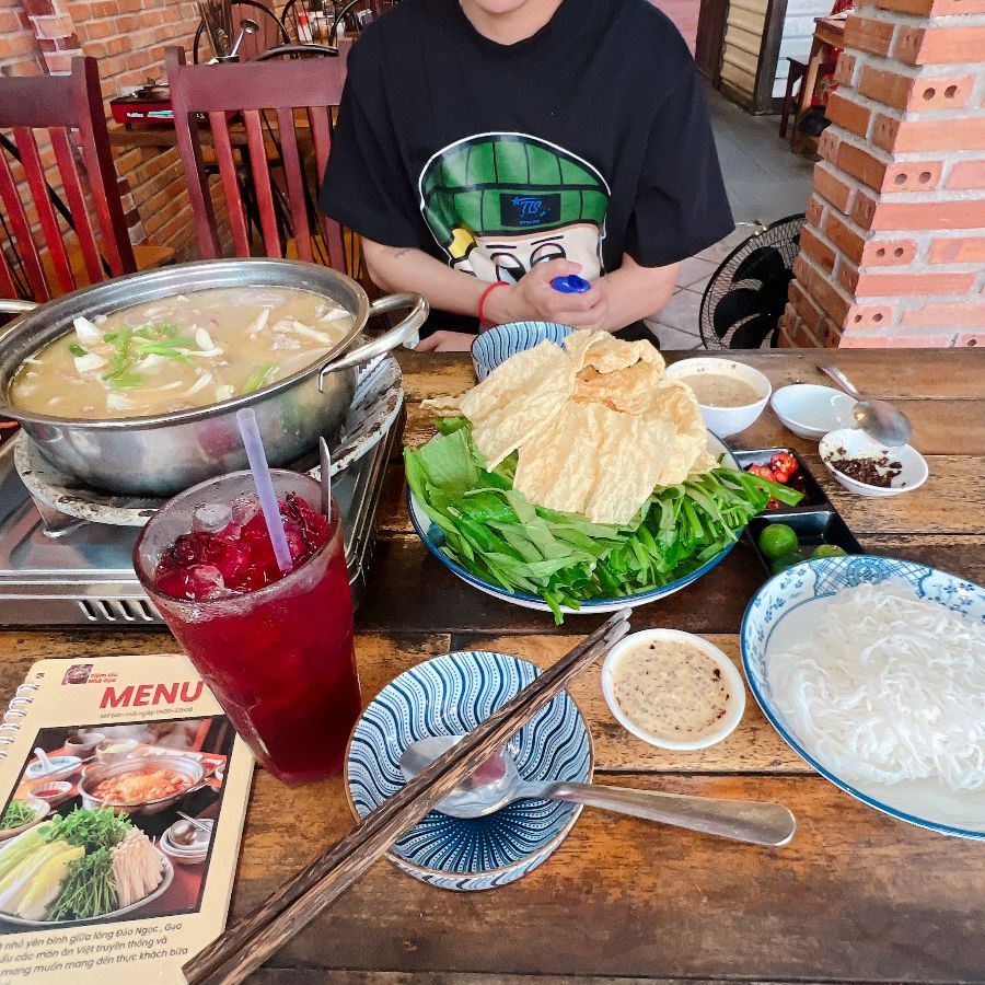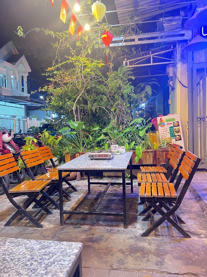 테이블 위에는 이미 휴대용 가스버너가 놓여 있었고, 그 옆으로는 핫팟에 곁들일 신선한 라임과 고추, 그리고 알록달록한 디핑 소스 재료들이 정갈하게 준비되어 있었습니다. 이 작은 디테일들이 음식에 대한 기대감을 더욱 증폭시켰습니다. 밖에서 식사하는 공간도 마련되어 있었는데, 푸른 식물들과 베트남 깃발 모양의 등이 어우러져 이국적인 정취를 물씬 풍겼습니다. 다만, 선풍기만으로는 더위를 식히기에는 역부족이라 실내를 선호하는 손님들도 많았다고 합니다.
