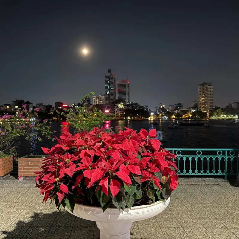 밤에는 도시의 불빛이 반짝이는 야경을 감상하며 색다른 분위기를 느낄 수 있을 것 같습니다. 특히 붉은색 포인세티아가 장식된 야외 테라스에서 치킨을 먹는다면 더욱 특별한 경험이 될 것입니다.