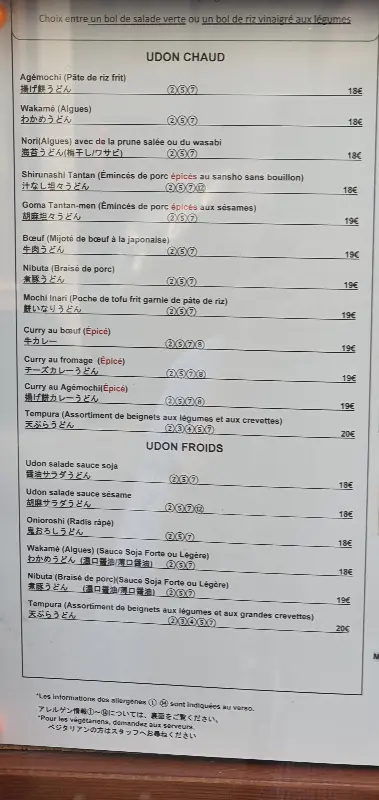 메뉴판을 살펴보니 다양한 종류의 우동이 있었다. 따뜻한 우동(UDON CHAUD)으로는 와카메 우동, 노리 우동, 차슈 우동, 커리 우동 등이 있었고, 차가운 우동(UDON FROIDS)으로는 붓카케 우동, 히야시 우동 등이 있었다. 또한, 튀김류와 덮밥류도 준비되어 있어 선택의 폭이 넓었다.