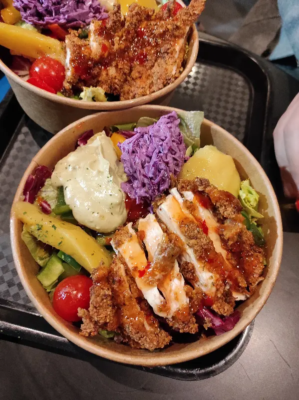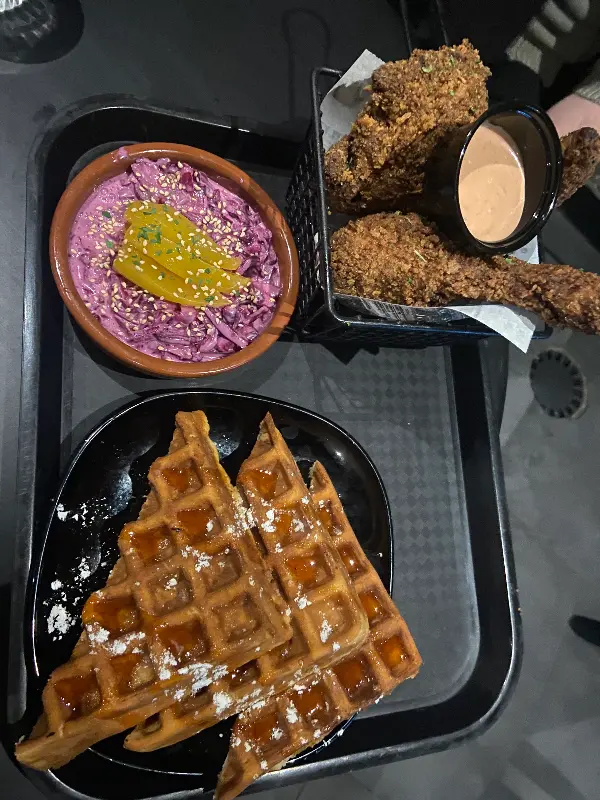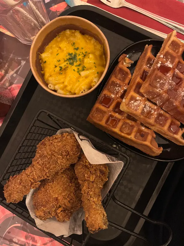 Juicypop의 메뉴는 100% 미국식 특선 요리로 가득했다. 특히 빵가루 입힌 닭고기는 버킷, 버거, 와플 등 다양한 형태로 제공되어 취향에 따라 즐길 수 있었다. 닭고기 자체의 퀄리티도 훌륭했지만, 겉은 바삭하고 속은 촉촉한 완벽한 튀김옷이 감탄을 자아냈다. 짭짤하면서도 고소한 닭고기는 달콤한 와플과 환상적인 조화를 이루었다.