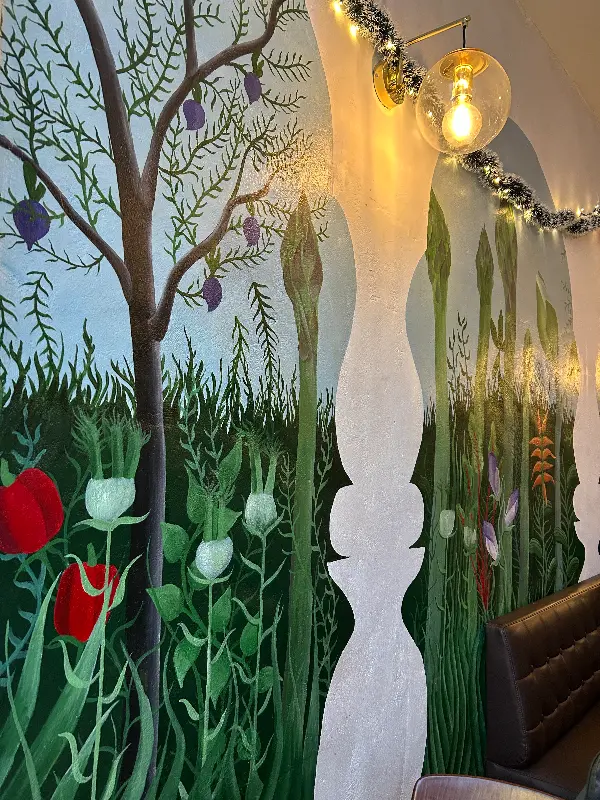 레스토랑 내부는 생각보다 아담했지만, 벽면에 그려진 싱그러운 식물 그림과 은은한 조명이 편안한 분위기를 자아냈다. 마치 비밀 정원에 들어온 듯한 느낌. 벽 한쪽에는 아스파라거스와 토마토 그림이 그려져 있고, 전구색 조명이 따뜻함을 더했다. 테이블 간 간격도 적당해서 오붓하게 식사를 즐기기에 안성맞춤이었다.