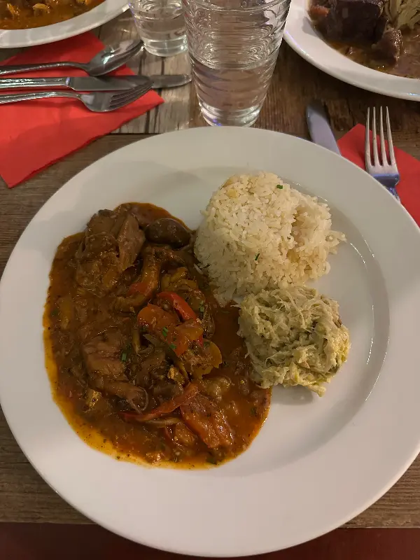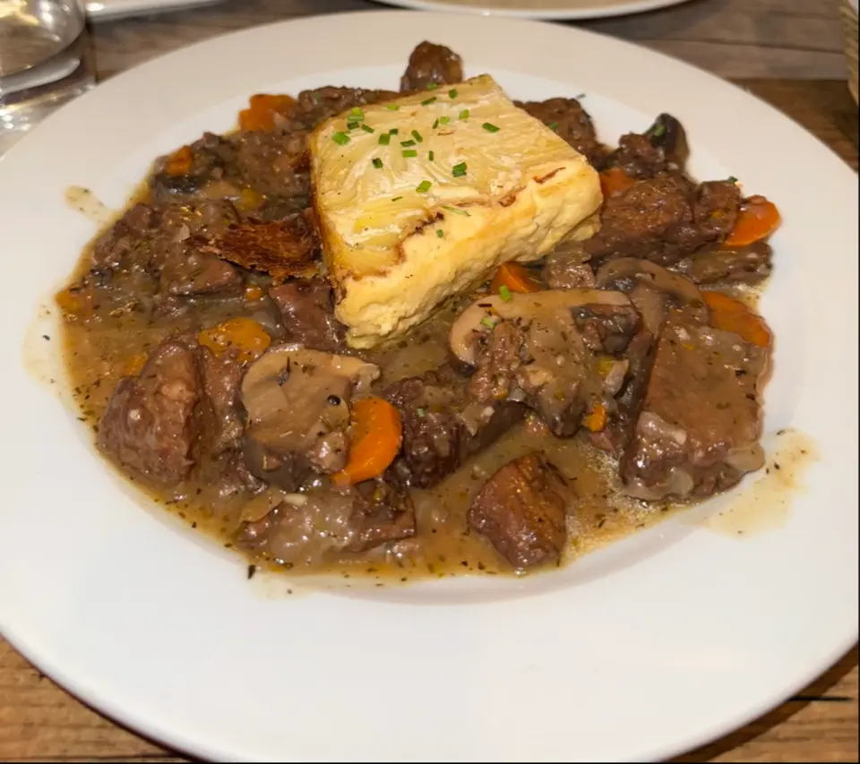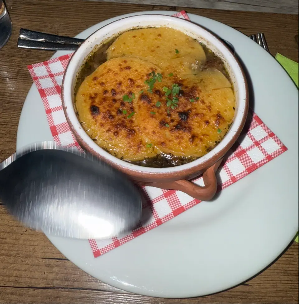 고심 끝에 프렌치 어니언 수프와 세이탄 브루기뇽, 그리고 오늘의 메뉴인 루바브&애플파이를 주문했다. 가장 먼저 나온 것은 프렌치 어니언 수프. 뜨겁게 달궈진 그릇 안에는 황금빛 치즈가 듬뿍 덮여 있었고, 깊고 진한 양파 향이 식욕을 자극했다.