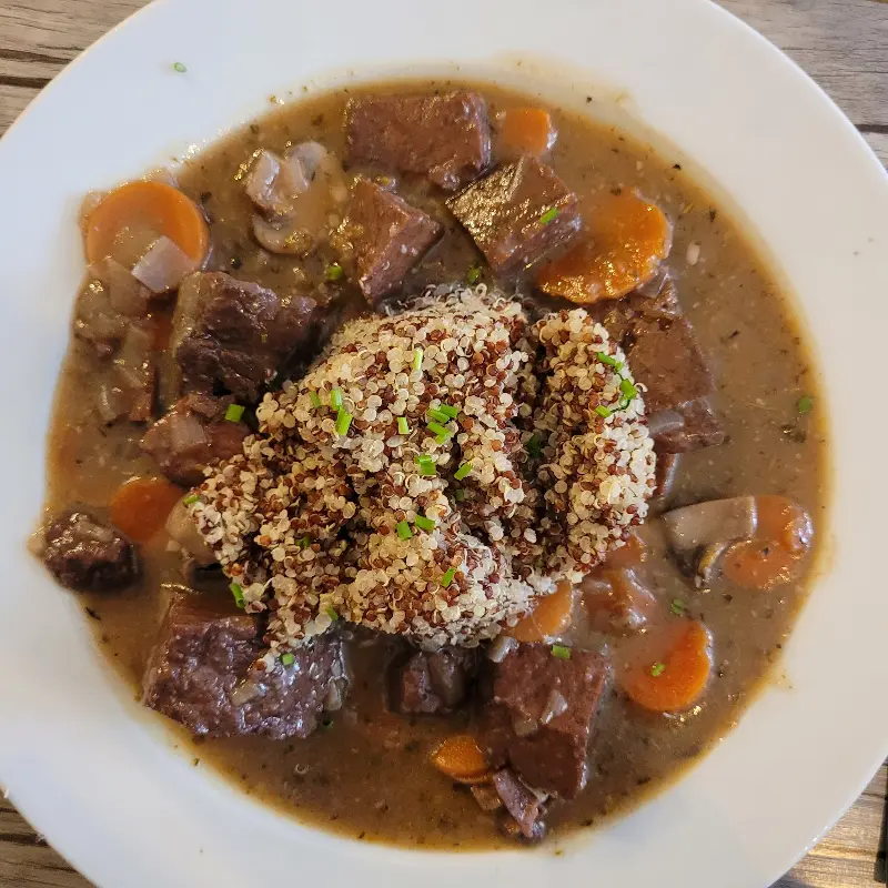 세이탄은 콩 단백질로 만든 대체육인데, 쫄깃한 식감이 인상적이었다. 스튜는 깊고 풍부한 맛이었지만, 개인적으로는 세이탄의 식감이 조금 아쉬웠다. 하지만 세이탄을 즐겨 먹는 사람들에게는 훌륭한 선택이 될 것 같았다. 곁들여 나온 퀴노아는 스튜의 풍미를 더욱 깊게 만들어줬다.