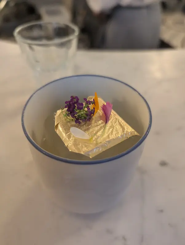 금박과 꽃으로 장식된 ‘구스타프’ 칵테일은 Bar Nouveau의 시그니처 메뉴입니다.