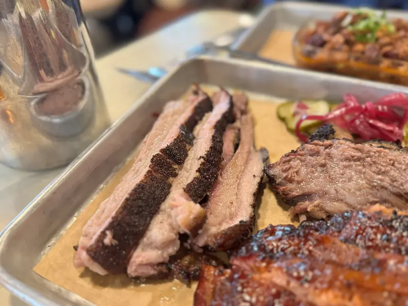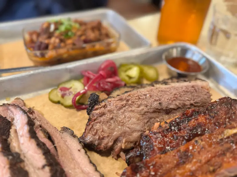 윤기가 흐르는 브리스킷, 곁들여진 피클과 소스가 풍미를 더한다.