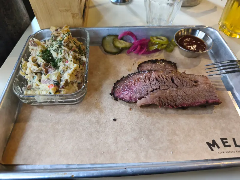 접시에 담겨 나온 브리스킷은 겉은 검붉은 빛깔을 띠고, 속은 촉촉한 육즙을 머금고 있었다. 나이프로 살짝만 눌러도 부드럽게 찢어지는 브리스킷은 입안에서 사르르 녹아내리는 듯했다. 훈연 향은 은은하게 퍼져 나가고, 고소한 육즙은 입안 가득 풍미를 더한다. 특히, 멜트만의 비법 소스와 함께 곁들여 먹으면, 브리스킷의 풍미가 한층 더 깊어진다.
