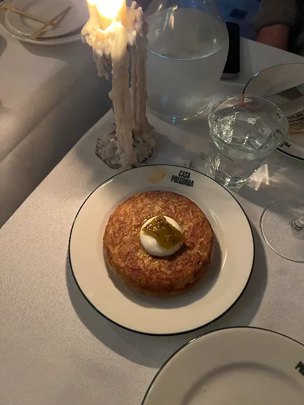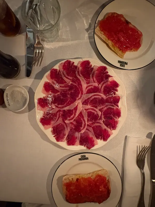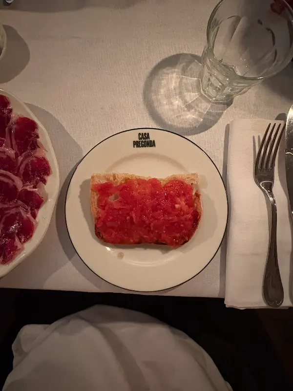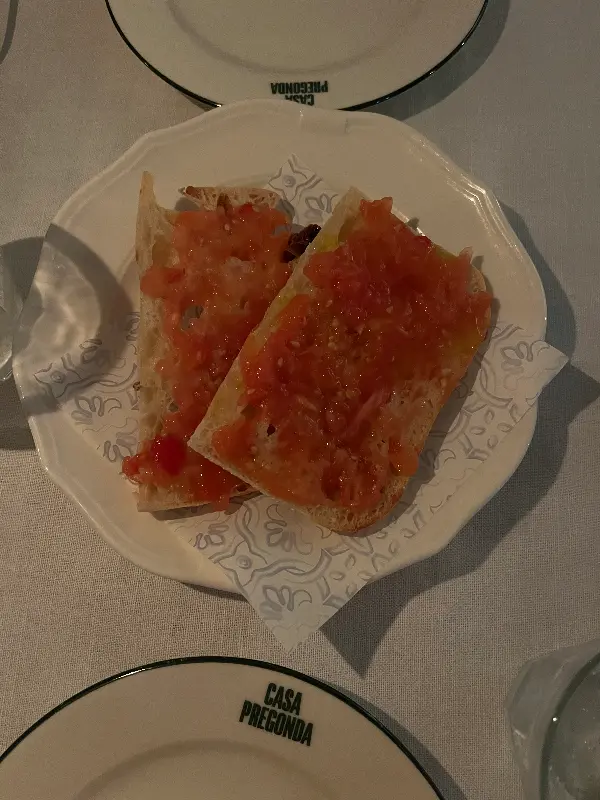 다음으로 나온 메뉴는 ‘판 콘 토마테(Pan con Tomate)’였다. 바삭하게 구워진 빵 위에 신선한 토마토를 올린 판 콘 토마테는, 단순하면서도 깊은 풍미를 자랑하는 스페인의 대표적인 음식이다. 카사 프레곤다의 판 콘 토마테는 신선한 토마토의 풍미와 바삭한 빵의 식감이 완벽하게 어우러져, 입맛을 돋우는 데 제격이었다.
