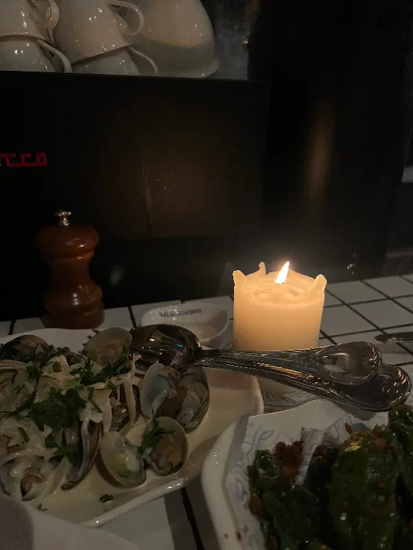 함께 주문한 ‘조개 요리(Clams)’는 신선한 해산물의 풍미를 그대로 느낄 수 있는 메뉴였다. 촉촉하고 쫄깃한 조갯살은 입안에서 부드럽게 녹아내렸고, 함께 곁들여진 소스는 조개의 풍미를 더욱 풍성하게 만들어주었다. 촛불 아래 반짝이는 조개 요리의 모습은 시각적인 즐거움까지 더해주었다.