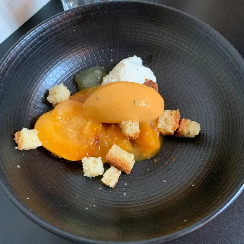 디저트 플레이팅은 마치 예술 작품을 보는 듯했다. 흑색의 접시 위에 놓인 오렌지 빛깔의 소르베와 앙증맞은 큐브 모양의 빵, 그리고 하얀 크림의 조화는 시각적인 즐거움까지 선사했다. 입에 넣는 순간, 달콤함과 상큼함이 입안 가득 퍼지면서 황홀경에 빠지는 듯했다.