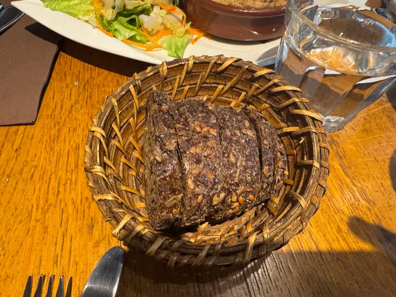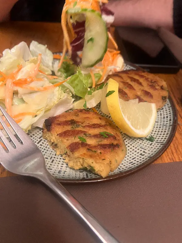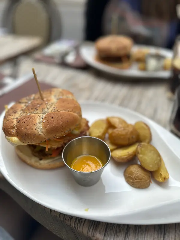 고민 끝에 채식 카술레와 버거를 주문했습니다. 잠시 후, 테이블 위에 놓인 카술레는 보기만 해도 군침이 돌았습니다. 겉은 바삭하고 속은 촉촉한 콩과 야채들이 토마토 소스와 어우러져 깊고 풍부한 맛을 냈습니다. 특히, 은은하게 퍼지는 허브 향은 입맛을 돋우는 데 제격이었습니다. 신선한 채소 샐러드와 함께 제공된 따뜻한 빵은, 카술레와 곁들여 먹으니 더욱 맛있었습니다.