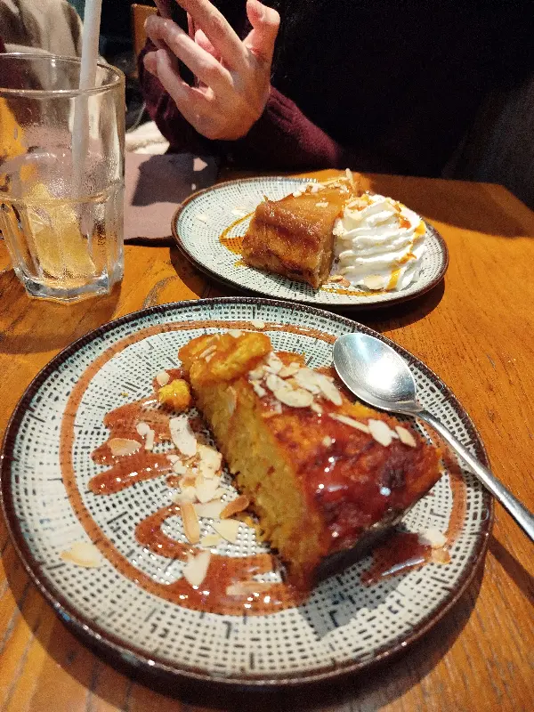 식사를 마치고, 디저트로 브라우니와 아이스크림을 주문했습니다. 따뜻한 브라우니 위에 차가운 아이스크림이 올려져 있는 모습은, 보기만 해도 행복해지는 기분이었습니다. 촉촉한 브라우니와 달콤한 아이스크림을 함께 먹으니, 입안에서 사르르 녹는 듯했습니다. 특히, 브라우니 위에 뿌려진 견과류는 고소한 풍미를 더했습니다. 완벽한 식사의 마무리였습니다.