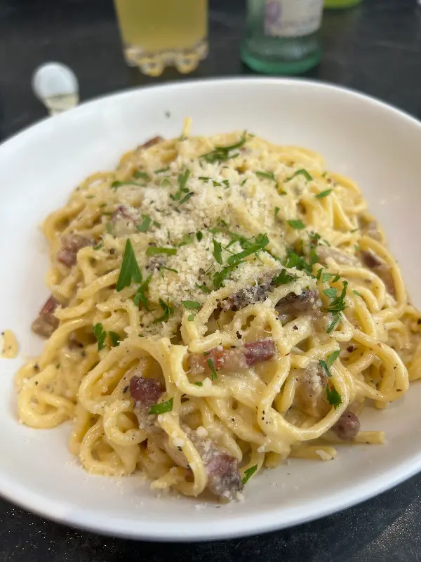 이곳의 대표 메뉴 중 하나는 바로 정통 카르보나라입니다. 많은 이들이 극찬하는 이 메뉴는, 신선한 재료와 정통 레시피로 만들어져 깊고 풍부한 맛을 자랑합니다. 한 입 맛보는 순간, 입 안 가득 퍼지는 고소함과 짭짤함의 조화는 감탄을 자아냅니다. 느끼함 없이 깔끔하게 마무리되는 뒷맛 또한 훌륭합니다. 사진 속 카르보나라는 윤기가 좌르르 흐르는 면발 위에 파슬리가 살포시 뿌려져 있어 더욱 먹음직스럽습니다 (Image 4).
