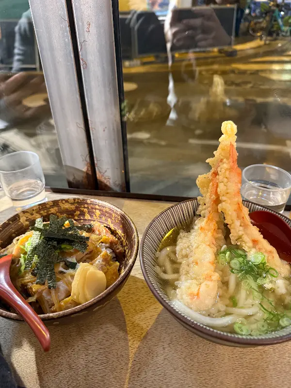 창밖 풍경을 바라보며 즐기는 덴뿌라우동과 타마고우동.
