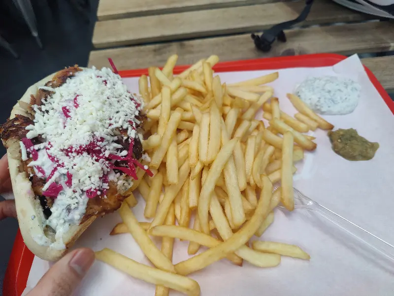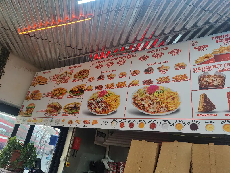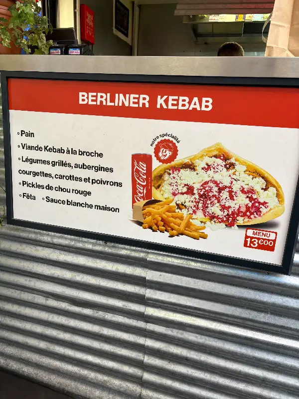 13유로짜리 세트 메뉴로 베를리너 샌드위치를 갈레트 버전으로 주문했습니다. 샌드위치는 푸짐하고 육즙이 가득했으며, 고기의 풍미가 일품이었습니다. 솔직히 파리 최고의 베를리너 케밥이라고 단언하기는 어렵지만, 샌드위치 자체는 훌륭했습니다. 다만, 감자튀김은 직접 만들었으면 더욱 좋았을 것 같습니다.