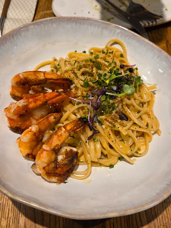 이곳의 또 다른 인기 메뉴인 새우 파스타는 정말 특별한 맛이었습니다. 살짝 매콤하면서도 크리미한 소스가 면에 잘 배어들어 환상적인 조화를 이루었습니다. 탱글탱글한 새우의 식감은 씹는 즐거움을 더했습니다. 지금까지 먹어본 파스타와는 차원이 다른, 잊을 수 없는 맛이었습니다. 한입 먹을 때마다 입 안 가득 퍼지는 풍미는 감탄을 자아냈습니다.