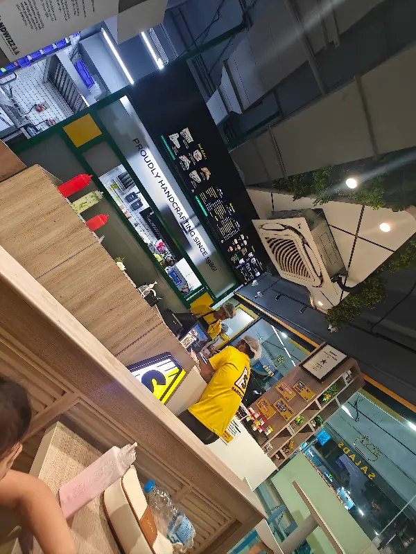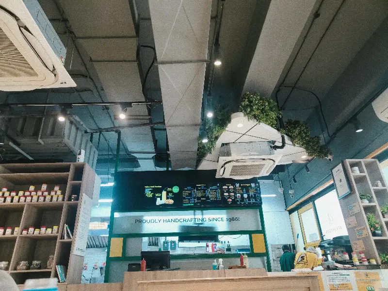 천장을 가로지르는 듯한 독특한 조경 장식은 실내에 싱그러움을 더하고, 은은한 조명은 따뜻한 분위기를 연출합니다. 한쪽 벽면을 가득 채운 메뉴판은 다양한 선택지를 제공하며, ‘Proudly Handcrafted Since 1986’이라는 문구는 Sandwizzaa의 오랜 역사와 자부심을 엿볼 수 있게 합니다.
