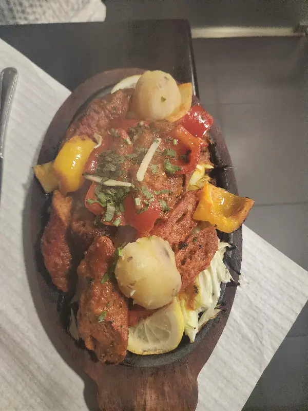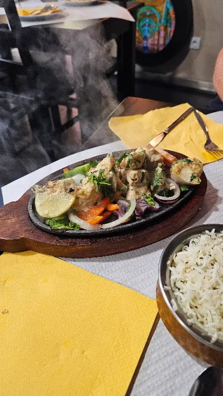 뜨겁게 달궈진 접시 위에서 지글거리는 탄두리 치킨. 매콤한 향신료 향이 코를 자극하며 침샘을 폭발시킵니다.