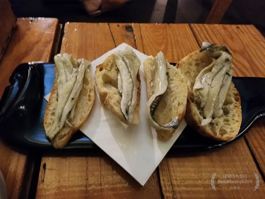 바삭한 빵 위에 올려진 엔초비는 짭짤하면서도 고소한 맛으로 와인과 환상적인 궁합을 자랑한다. 간단하지만 훌륭한 안주는 와인의 풍미를 더욱 깊게 만들어준다.