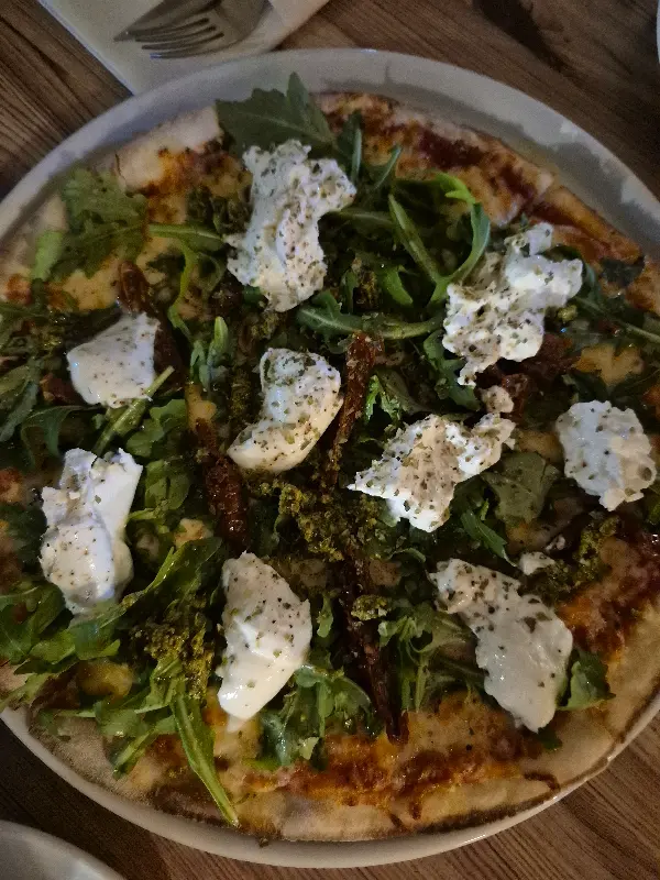 신선한 루꼴라와 촉촉한 부라타 치즈가 듬뿍 올라간 피자의 모습