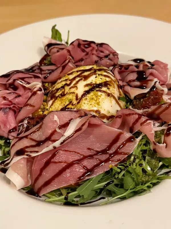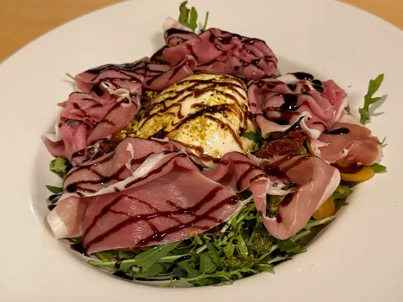 신선한 루꼴라 위에 프로슈토와 달콤한 소스가 어우러진 “샐러다 카이스 35”
