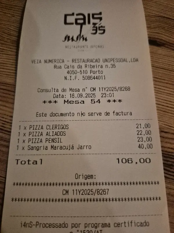 Cais 35에서 식사 후 받은 영수증. 메뉴 가격을 미리 확인하는 것이 좋습니다.