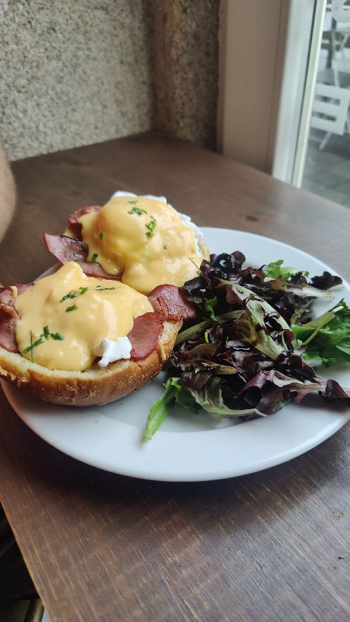 에그 베네딕트는 햄이나 베이컨을 곁들여 즐길 수 있어 더욱 만족스럽습니다. 노릇하게 구워진 빵 위에 얇게 저민 햄 또는 바삭하게 구운 베이컨이 올라가고, 그 위에는 완벽하게 삶아진 수란이 자리합니다. 포크로 수란을 터뜨리면 주르륵 흘러내리는 노른자가 빵과 어우러져 고소하고 부드러운 맛을 선사합니다. 신선한 샐러드와 함께 제공되어 영양 균형까지 고려한 든든한 한 끼 식사가 됩니다. 어떤 손님은 샐러드 드레싱 개선을 제안하기도 했지만, 전반적으로 신선한 채소와 함께 제공되는 브런치 메뉴는 맛과 비주얼 모두 훌륭하다는 평가를 받습니다.