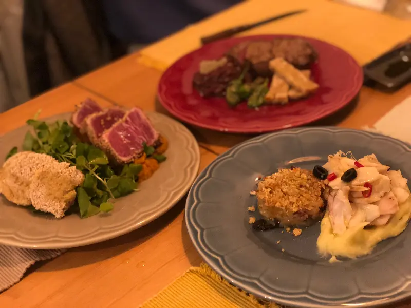 메뉴판을 꼼꼼히 살펴보니, 한국인들이 많이 찾는 메뉴는 감바스와 양고기 요리였다. 하지만 아쉽게도 메뉴가 많이 바뀌어 양고기 요리는 더 이상 판매하지 않는다고 했다. 대신 직원분이 추천해 준 Pork cheek과 viel을 주문하고, 감바스와 그린 와인을 함께 주문했다. 잠시 후, 테이블 위로 먹음직스러운 음식들이 하나둘씩 놓이기 시작했다. 먼저 감바스는 새콤달콤한 소스에 통통한 새우가 듬뿍 들어 있었다. 껍질이 모두 까져 있어 먹기 편했고, 귀한 마늘도 넉넉하게 들어 있었다. 빵을 소스에 찍어 먹으니, 그 맛이 더욱 환상적이었다.