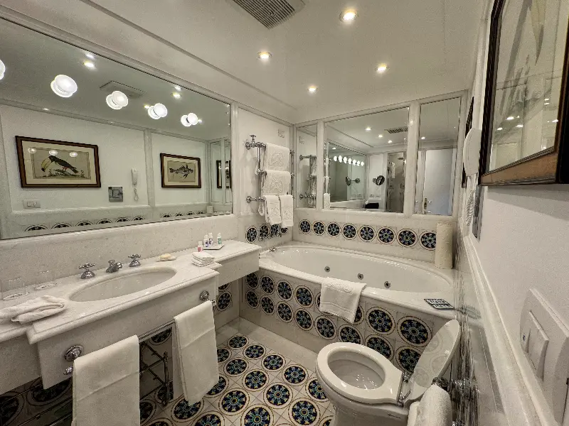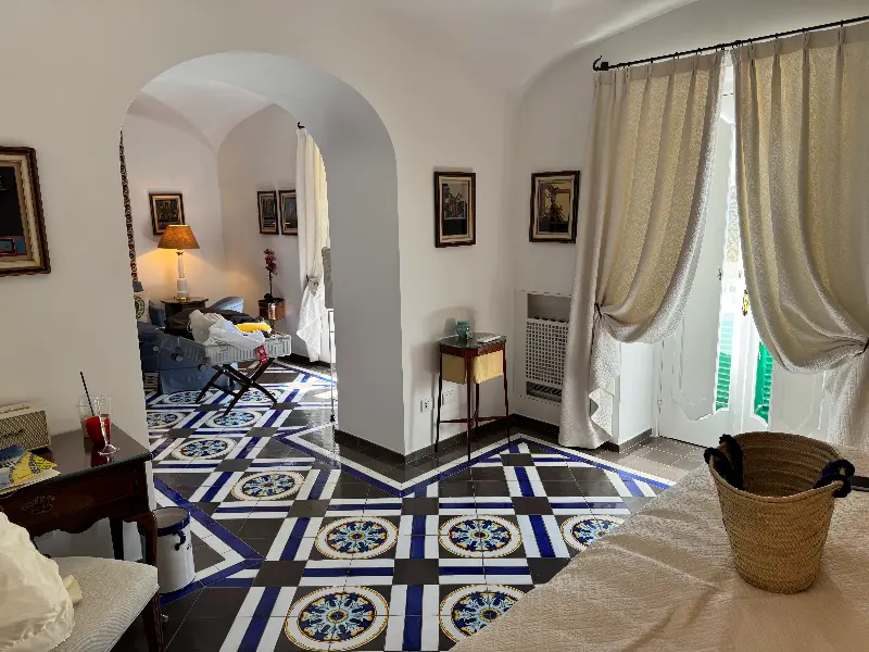 객실은 쥬니어 스위트룸으로, 기대했던 것보다 훨씬 더 훌륭했습니다. 발코니로 나가니, 포지타노의 전경이 한눈에 들어왔습니다. 눈부신 햇살 아래 반짝이는 바다, 그리고 절벽을 따라 옹기종기 모여있는 파스텔톤의 집들은 마치 동화 속 세상에 들어온 듯한 느낌을 선사했습니다. 객실은 아름답게 꾸며져 있었고, 우아하면서도 티끌 하나 없이 깨끗했습니다. 고급스러운 대리석 욕실은 여행의 피로를 풀어주기에 충분했습니다.