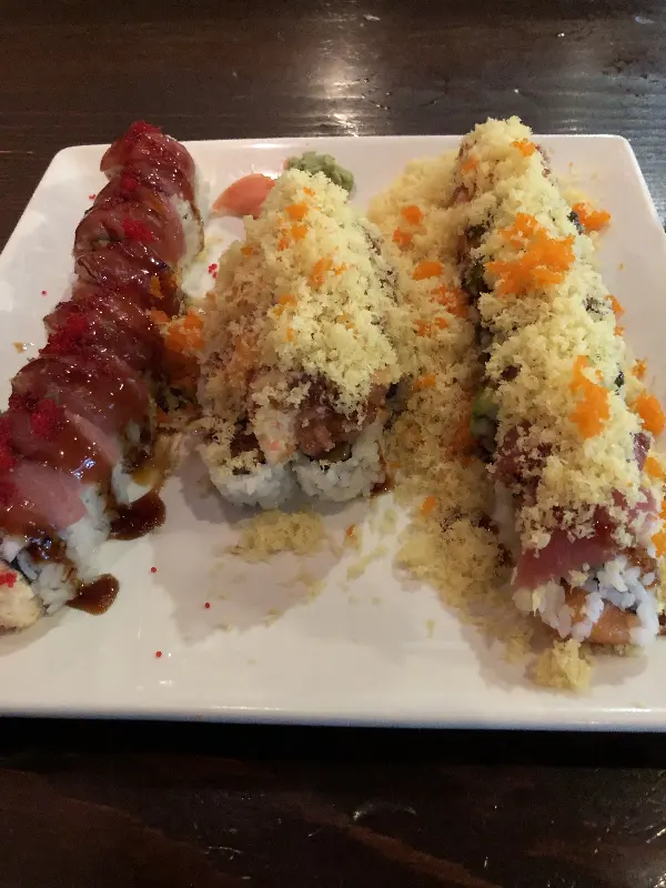 드디어 기다리고 기다리던 스시가 나왔다. 우리는 다양한 롤을 주문했는데, 그중에서도 가장 눈길을 사로잡은 것은 LSU 롤이었다. 화려한 색감과 독특한 모양새는 감탄을 자아내게 했다. 롤 위에 얹어진 토핑들은 마치 예술 작품을 보는 듯했다.