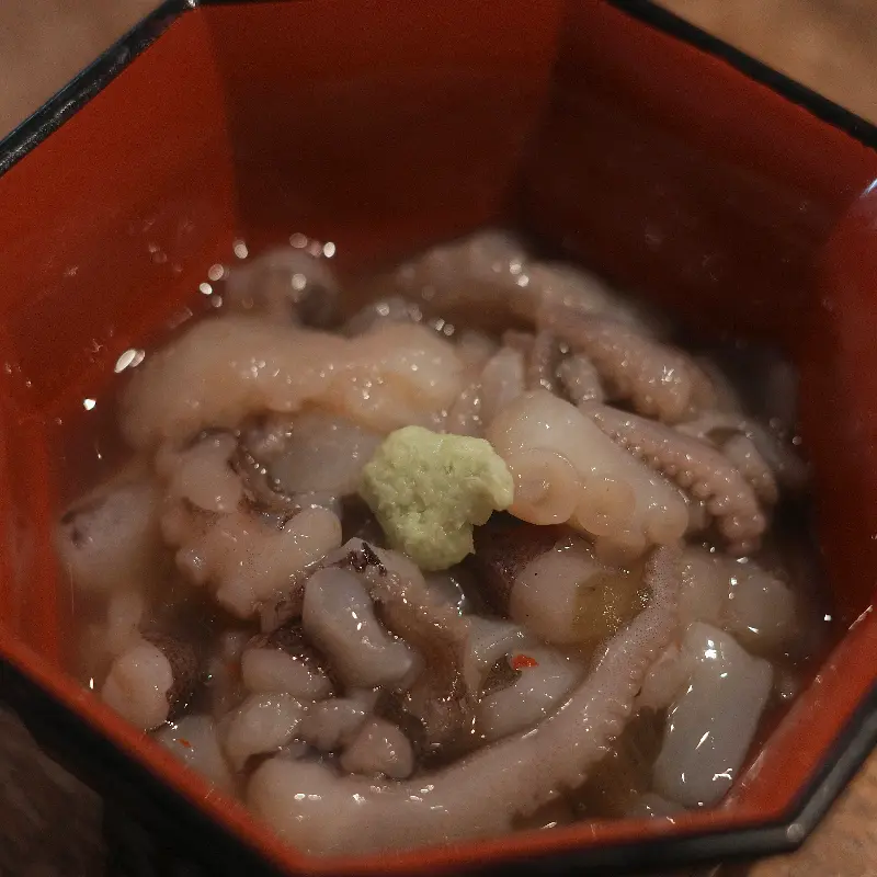 라멘과 함께 곁들여 먹기 위해 타코와사비를 주문했습니다. 사실 큰 기대는 하지 않았는데, 웬걸, 양도 푸짐하고 너무 맛있는 겁니다! 톡 쏘는 와사비와 쫄깃한 타코의 조합은 환상적이었습니다. 저도 모르게 두 번이나 더 시킬 뻔했답니다. 붉은색 나무 사각 그릇에 담겨 나온 타코와사비는 신선함이 눈으로도 느껴질 정도였습니다. 와사비의 알싸한 향이 코를 찌르면서 입맛을 돋우고, 쫄깃한 타코의 식감이 즐거움을 더했습니다.
