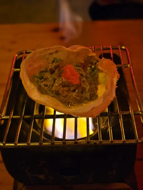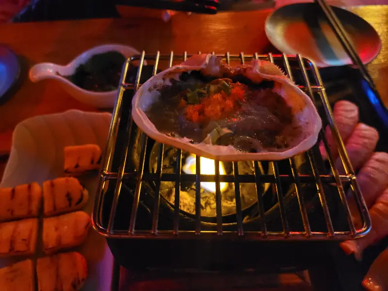 고심 끝에 가장 먼저 주문한 메뉴는 렌즈 뷰 추천에 있던 게알 구이였다. 작은 화로 위에 올려진 게딱지가 지글거리는 소리를 내며 서서히 익어갔다. 은은하게 퍼지는 고소한 냄새가 식욕을 자극했다. 드디어 한 입 맛보는 순간, 감탄사가 절로 나왔다. 부드러운 게살과 녹진한 내장이 어우러져 환상적인 맛을 선사했다. 입안 가득 퍼지는 풍미는 그야말로 황홀경이었다. 사진(Image 1)에서 보이듯, 작은 화로 위에서 따뜻하게 즐기는 게알 구이는 에코 이자카야만의 특별한 매력이다.