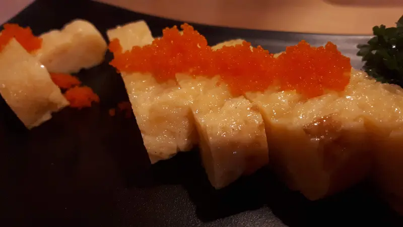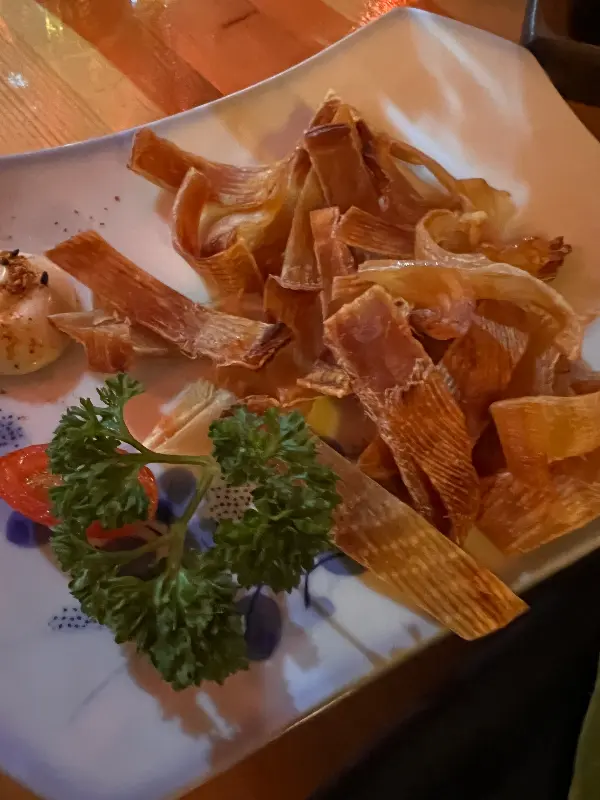 에코 이자카야에서 꼭 맛봐야 할 메뉴 중 하나는 구운 생선 크레페다. 얇고 부드러운 크레페 안에 촉촉한 생선 살이 가득 차 있었다. 달콤한 소스와 어우러져 입안에서 사르르 녹는 듯한 식감이 일품이었다. 특히, 달콤한 계란도 함께 곁들여 먹으니 더욱 풍성한 맛을 즐길 수 있었다. 사진(Image 4)에서 볼 수 있듯이, 정갈하게 담겨 나온 모습 또한 먹는 즐거움을 더했다.
