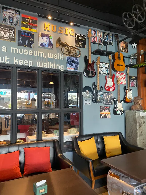 벽에 걸린 기타, 트럼펫, 그리고 LP판들은 카페의 분위기를 한층 더 풍성하게 만들어줍니다. 음악을 사랑하는 사람이라면 분명 이곳에 매료될 것입니다. 편안한 소파와 테이블은 여행의 피로를 잊게 해주는 아늑한 공간을 제공합니다. 붉은색과 노란색 쿠션이 놓인 검은색 가죽 소파는 편안함을 더해주며, 나무 테이블은 따뜻한 느낌을 줍니다.