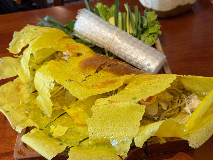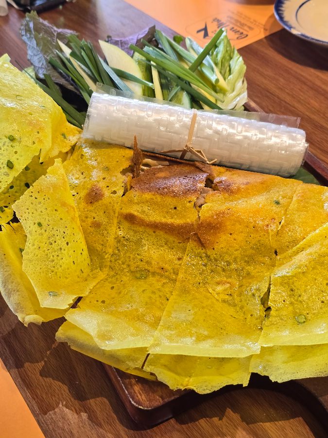 반쎄오의 푸짐한 양은 여럿이 함께 즐기기에도 충분합니다. 노릇하게 구워진 반쎄오의 비주얼은 식욕을 자극하며, 한 입 베어 물면 입안 가득 퍼지는 고소함과 신선한 채소의 아삭함이 잊을 수 없는 조화를 이룹니다.