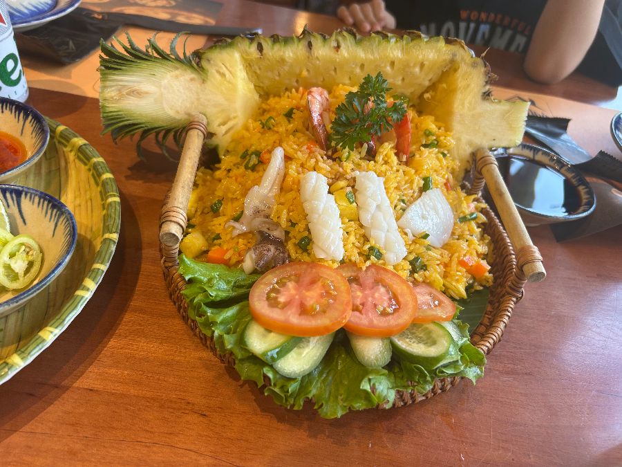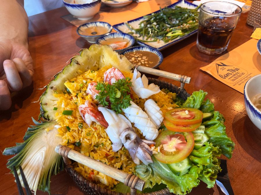 간간한 맛은 간장과 곁들여 먹으면 더욱 훌륭하며, 싱싱한 새우와 오징어가 듬뿍 들어가 있어 해산물을 좋아하는 사람들에게 특히 인기가 많습니다. 파인애플 볶음밥은 그 자체로 훌륭한 한 끼 식사이자, 베트남 여행의 특별한 추억을 만들어 줄 메뉴입니다.