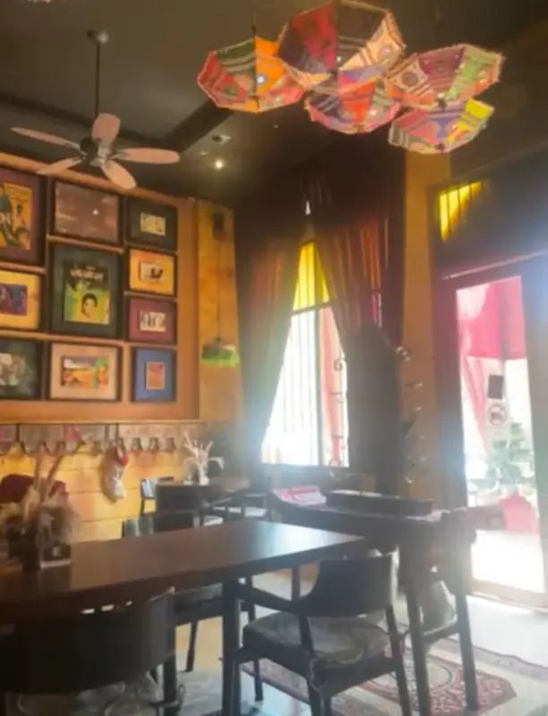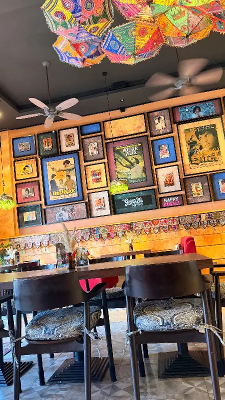 레스토랑에 들어서자마자 눈에 띄는 것은 화려하면서도 아늑한 인테리어다. 천장에는 알록달록한 우산들이 거꾸로 매달려 있고, 벽면에는 인도 영화 포스터와 소품들이 가득 채워져 있어 마치 볼리우드 영화 세트장에 들어온 듯한 착각을 불러일으킨다. 은은한 조명과 흘러나오는 인도 음악은 분위기를 더욱 고조시킨다.