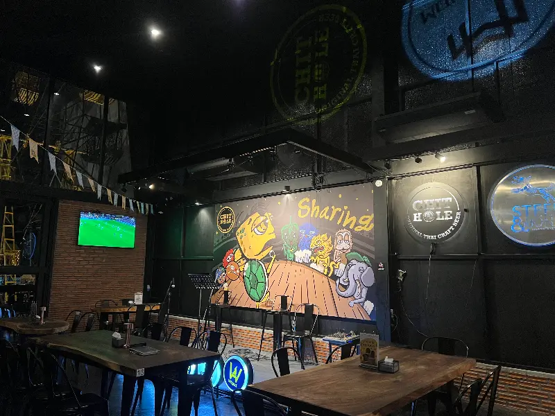 실내외 좌석이 마련되어 있어 원하는 분위기를 선택할 수 있었고, 무료 당구대와 축구 경기를 볼 수 있는 TV까지 준비되어 있었다. 특히, 벽면에 그려진 Chit Hole의 로고와 맥주 관련 그림들은 힙스터 감성을 자극하며, 이곳만의 독특한 분위기를 더욱 돋보이게 했다. 벽돌과 나무 소재를 활용한 인테리어는 편안하면서도 세련된 느낌을 주었고, 은은한 조명은 아늑함을 더했다. 마치 잘 꾸며진 친구의 아지트에 놀러 온 듯한 편안함 덕분에, 처음 방문했음에도 불구하고 어색함 없이 공간에 스며들 수 있었다.