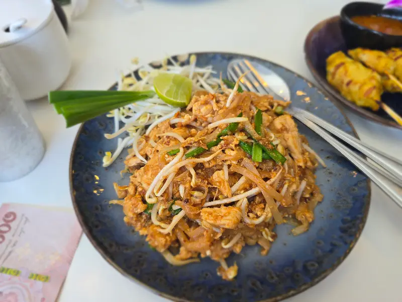 가장 먼저 눈길을 사로잡은 것은 팟타이였습니다. 윤기가 흐르는 면발 위에 큼지막한 새우가 올려져 있는 모습은 그야말로 군침이 돌았습니다. 한 입 맛보니, 새콤달콤한 소스와 쫄깃한 면발, 그리고 신선한 새우의 조화가 환상적이었습니다. 특히, 닭고기 팟타이는 69바트라는 저렴한 가격에도 불구하고 푸짐한 양을 자랑했습니다. 팟타이 위에 뿌려진 땅콩 가루는 고소함을 더해주었고, 라임즙을 살짝 뿌려 먹으니 상큼함까지 더해져 더욱 맛있었습니다.