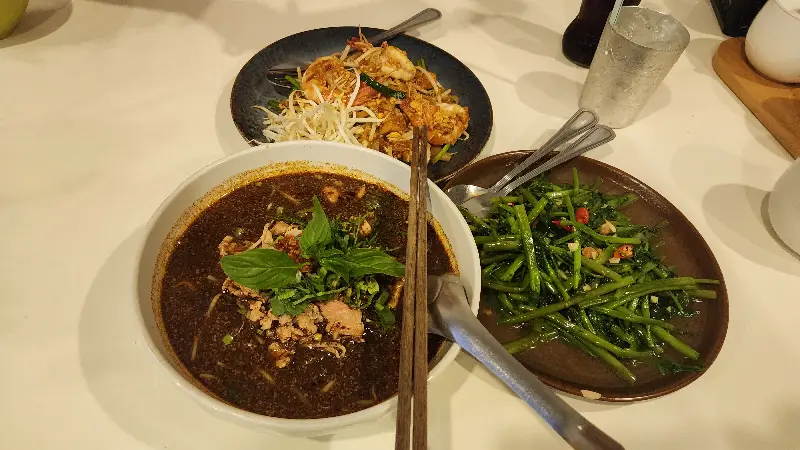 이곳의 가장 큰 매력은 다양한 종류의 국수와 국물을 취향에 따라 조합할 수 있다는 점입니다. 메뉴판을 펼쳐 들고 고민에 빠졌습니다. S2는 우육탕면 맛, S3는 맑은 탕 맛이라고 하니 더욱 궁금해졌습니다. 직원분의 추천을 받아 S4(Tom Yum) 국물에 Small Rice Noodle(N2)을 선택하고, 닭고기 팟타이와 돼지고기 사떼까지 주문을 마쳤습니다. 마치 나만의 요리를 주문하는 듯한 설렘이 느껴졌습니다.