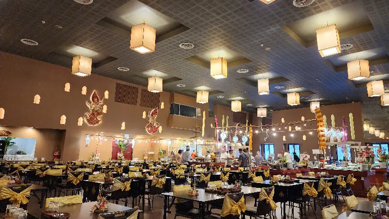 레스토랑에 들어서자마자 눈앞에 펼쳐진 것은 태국 전통 시장을 그대로 옮겨 놓은 듯한 풍경이었다. 넓은 홀에는 테이블들이 정갈하게 놓여 있었고, 주변으로는 다양한 음식 가판대들이 줄지어 서 있었다. 각 가판대마다 특색 있는 음식들이 가득 차 있어, 마치 축제에 온 듯한 기분이었다. 은은한 조명 아래, 황금색 장식이 더해진 의자들이 고급스러움을 더했다.