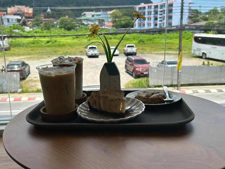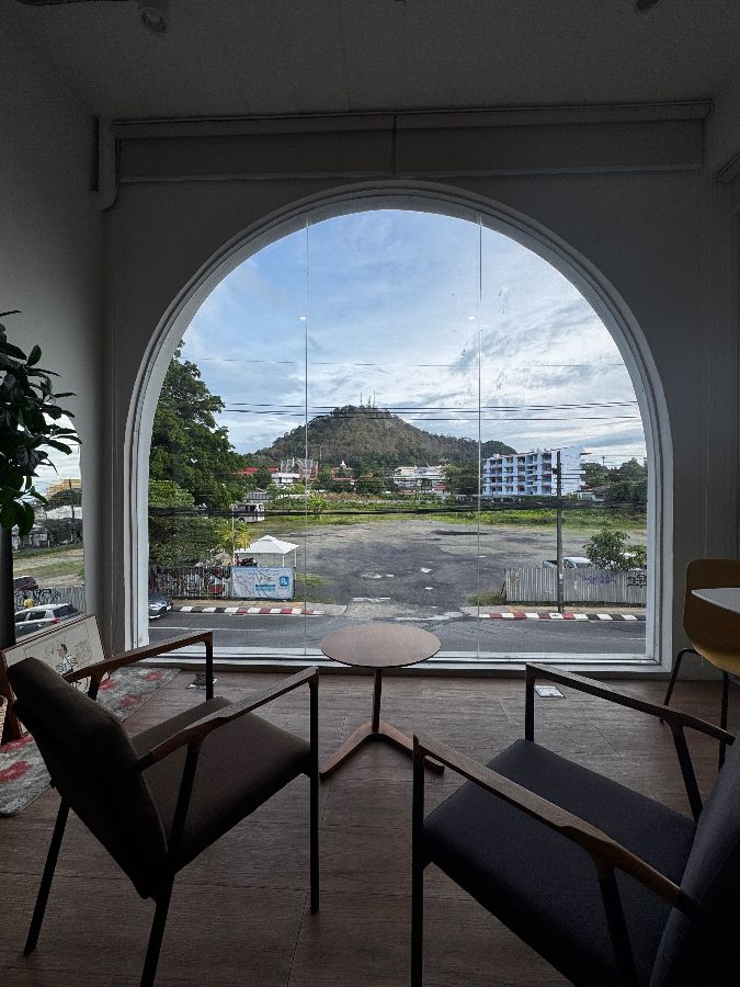 고민 끝에, 이곳의 대표 메뉴라는 ‘Dirty Coffee’와 아이스 카페라떼를 주문했다. 2층으로 올라가는 계단은 다소 가팔랐지만, 직원분이 직접 음료를 가져다주시는 친절함에 감동했다. 2층은 1층보다 더 넓고 테이블 간 간격도 넉넉해서 편안하게 시간을 보낼 수 있었다. 특히 창밖으로 펼쳐지는 푸켓의 풍경은 마치 그림 같았다. 둥근 아치형 창문 너머로 보이는 탁 트인 시야는 RestDay만의 매력적인 포인트였다.