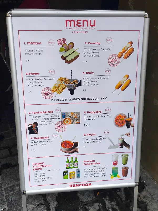 가게 앞에 놓인 메뉴판을 살펴보니, 핫도그를 메인으로 떡볶이, 한국식 치킨 등 다양한 메뉴가 준비되어 있었다.
