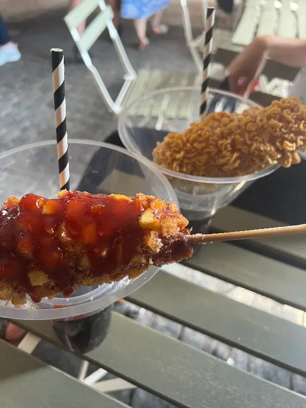 드디어 기다리던 핫도그가 나왔다. 눈으로 보기에도 바삭해 보이는 핫도그 위에는 케첩, 머스타드, 치킨 소스가 뿌려져 있었다. 한 입 베어 무니, 겉은 바삭하고 속은 촉촉한 완벽한 조화가 입안 가득 퍼져 나갔다. 특히 감자 핫도그는 겉에 붙은 감자 토핑이 바삭함을 더했고, 핫도그 속 치즈는 쭈욱 늘어나는 비주얼과 함께 고소한 풍미를 선사했다.
