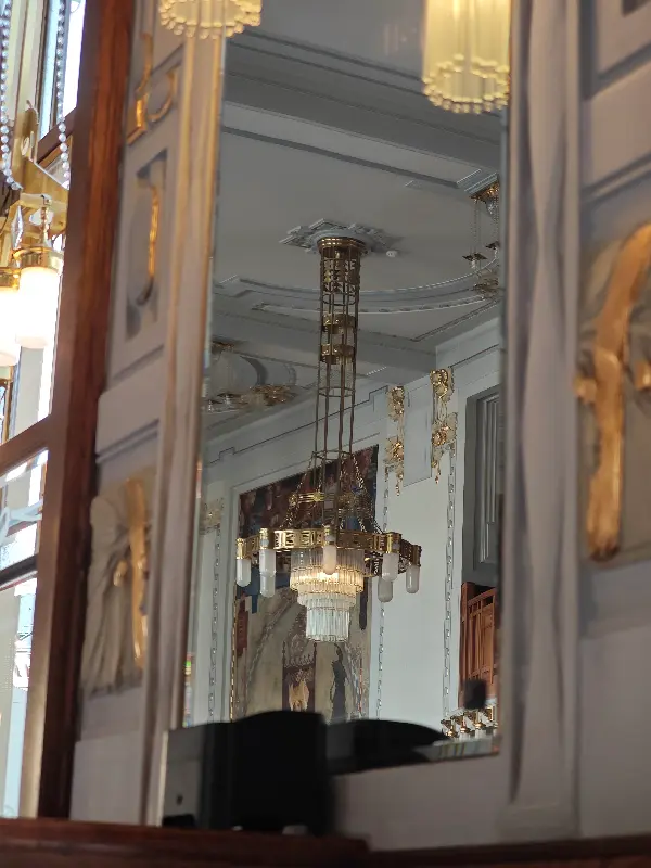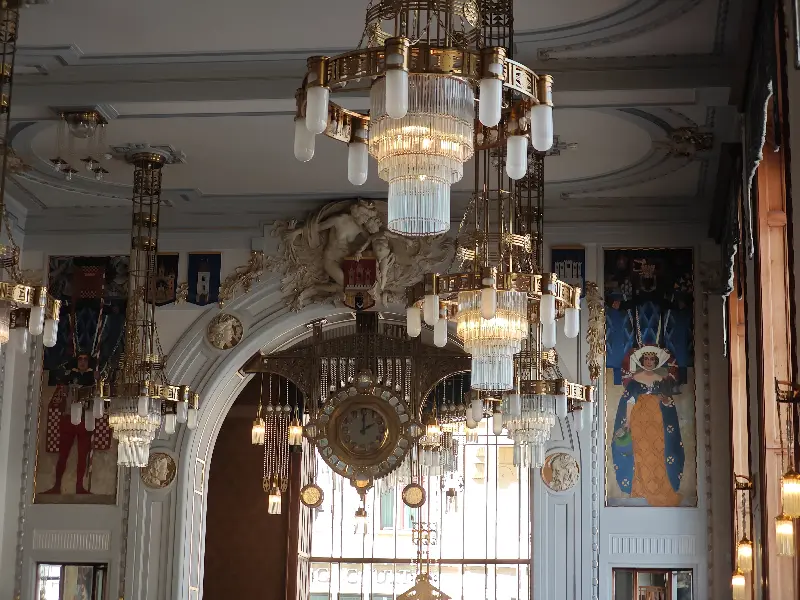 레스토랑 내부는 그야말로 아르누보 양식의 정수를 보여줍니다. 높은 천장에 매달린 크리스탈 샹들리에의 빛이 섬세하게 조각된 벽면과 앤티크 가구들을 비추며 황홀한 분위기를 자아냅니다. 벽면에는 섬세한 그림과 장식들이 가득하며, 고풍스러운 가구들은 마치 과거로 시간 여행을 온 듯한 느낌을 선사합니다.