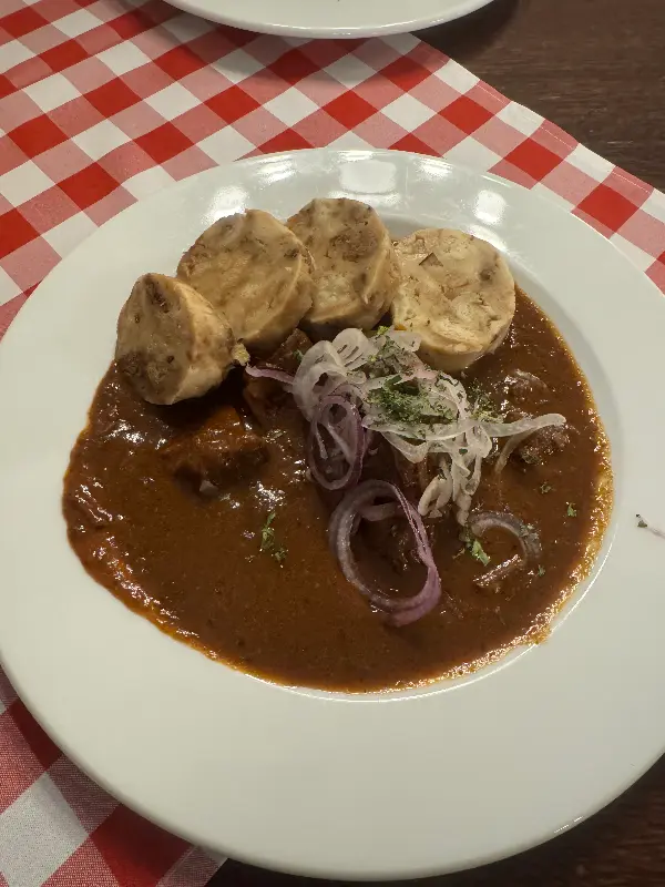 진한 소스와 부드러운 고기가 환상적인 조화를 이루는 굴라시는 체코 전통 음식의 정수를 보여줍니다.