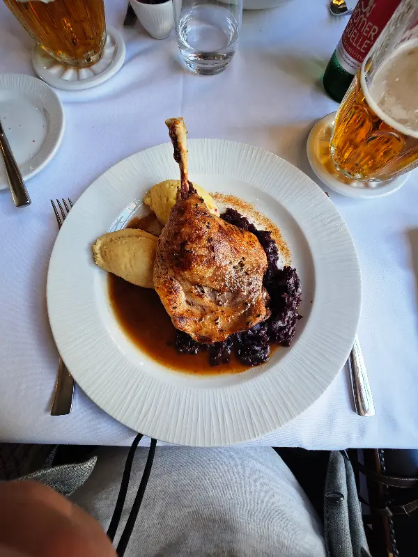 겉은 바삭하고 속은 촉촉한 오리 구이는 체코 맥주와 환상적인 궁합을 자랑합니다.