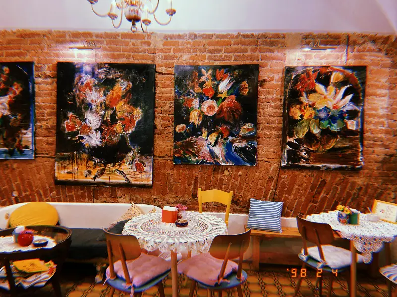 구석구석 놓인 화분들은 실내에 생기를 불어넣고, 벽돌 벽에 걸린 그림들은 갤러리에 온 듯한 느낌을 선사했다. 창가 자리에는 레이스 커튼이 드리워져 있어 햇살이 부드럽게 스며들었다.