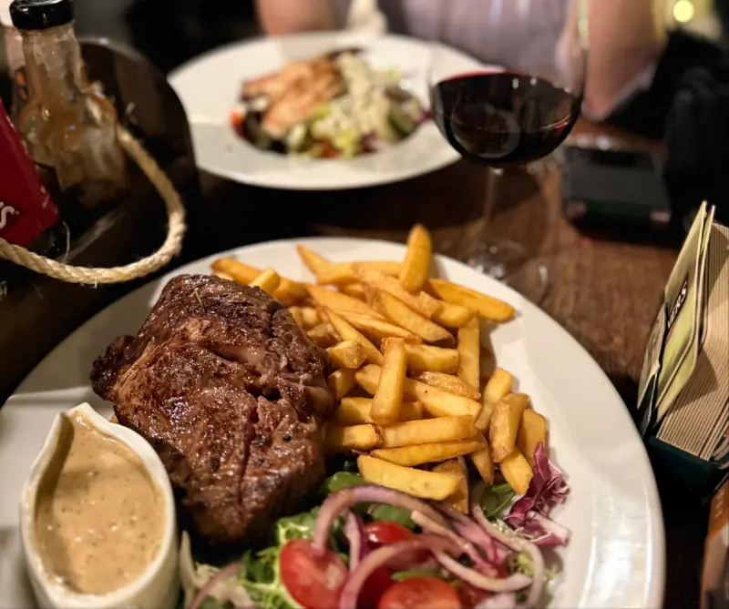 육즙 가득한 스테이크와 바삭한 감자튀김의 조화. 곁들여진 샐러드가 느끼함을 잡아줍니다.