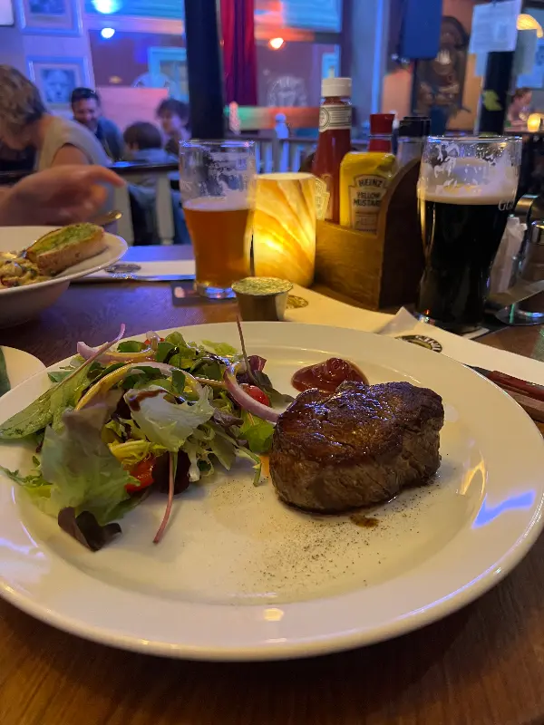 프라하에 머무는 동안 이 펍을 7일 동안 2번이나 방문했습니다. 그만큼 저에게는 매력적인 곳이었습니다. 특히 시금치 파스타와 스테이크는 꼭 먹어봐야 할 메뉴입니다. 신선한 시금치와 크림 소스가 어우러진 시금치 파스타는 부드러우면서도 고소한 맛이 일품입니다. 스테이크는 육즙이 풍부하고 부드러워서 입에서 살살 녹았습니다.