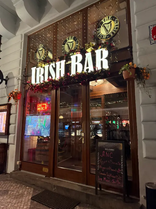 프라하의 낭만적인 밤, 골목길을 거닐다 우연히 발견한 아일랜드 펍. 여가수의 라이브 공연이 흐른다는 이야기에 이끌려 문을 열었습니다. 낡은 나무 문이 열리는 소리와 함께, 활기 넘치는 음악 소리가 귓가를 간지럽혔습니다. 붉은 벽돌과 어두운 나무 가구, 은은한 조명이 만들어내는 아늑한 분위기가 마치 시간 여행을 떠나온 듯한 기분을 선사했습니다.